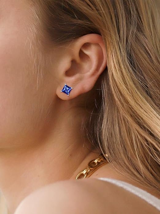 Minimalist Princess Cut Sapphire Stud Earrings | White Gold